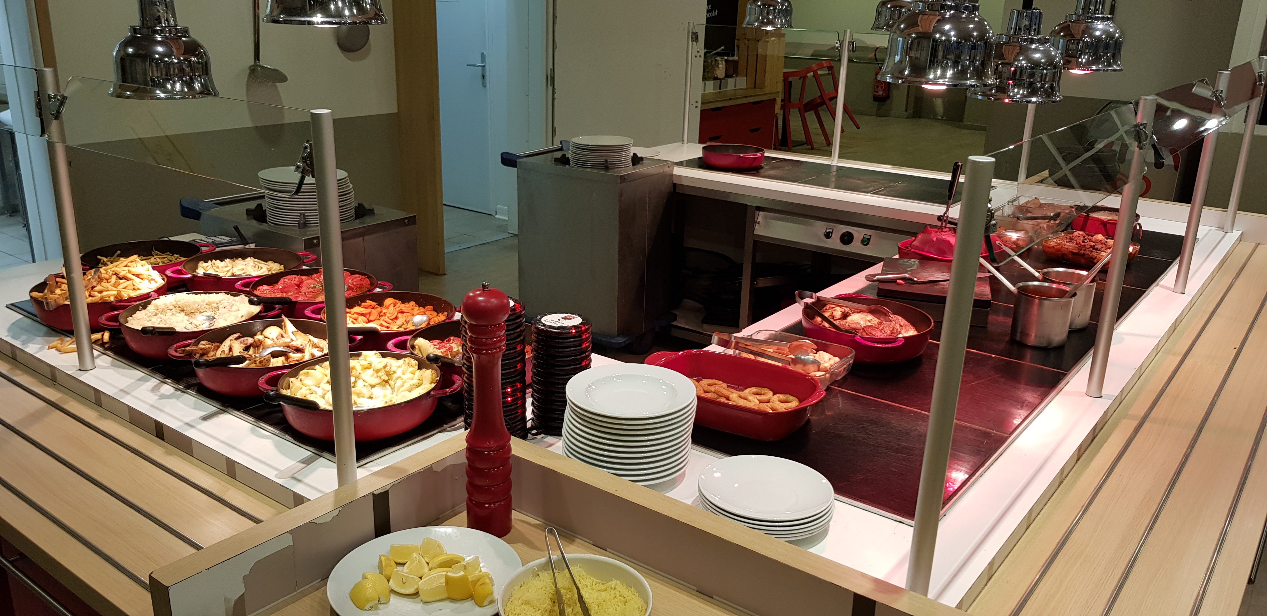 Tres bonne expérience : arrivés à 13h55, tout était disponible et tres bon. 10,50 ou 11euros le menu : entrées à volonté +plat du jour avec legumes à volonté + dessert à volonté. Ce jour là, les plats du jour étaient: boulettes d'agneau et aubergines, ou cervelas. Personnel tres agréable, qui repond aux questions avec plaisir. Aucune attente, locaux et tables tres propres. Buffets propre, et bien entretenus, alors que nous étions à l'heure de fin de service... Tout y etait tres bon: des entrées, aux plats, bonne variétés de legumes, et les desserts au top. ( rien à voir avec les buffets type Flunchs ou autres très bas de gamme, qui vous degouttent des cafeterias). Une cafeteria queje recommande, pour manger rapidement, à un bon prix