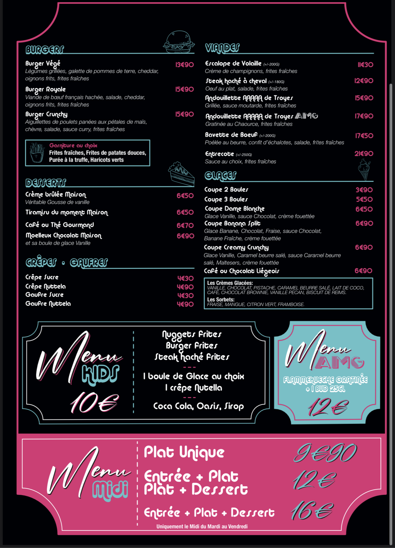 Nous voulions découvrir ce nouvel endroit qui donnait envie vue la publicité ! La déco originale, thème rétro... En revanche le service est beaucoup trop long !!! Ça gâche tout. Nous aurions aimés avoir un fond musical dès le début de soirée et non à 22h30 au moment où nous mangions. Rien à dire niveau rapport qualité /prix et personnel très sympathique !