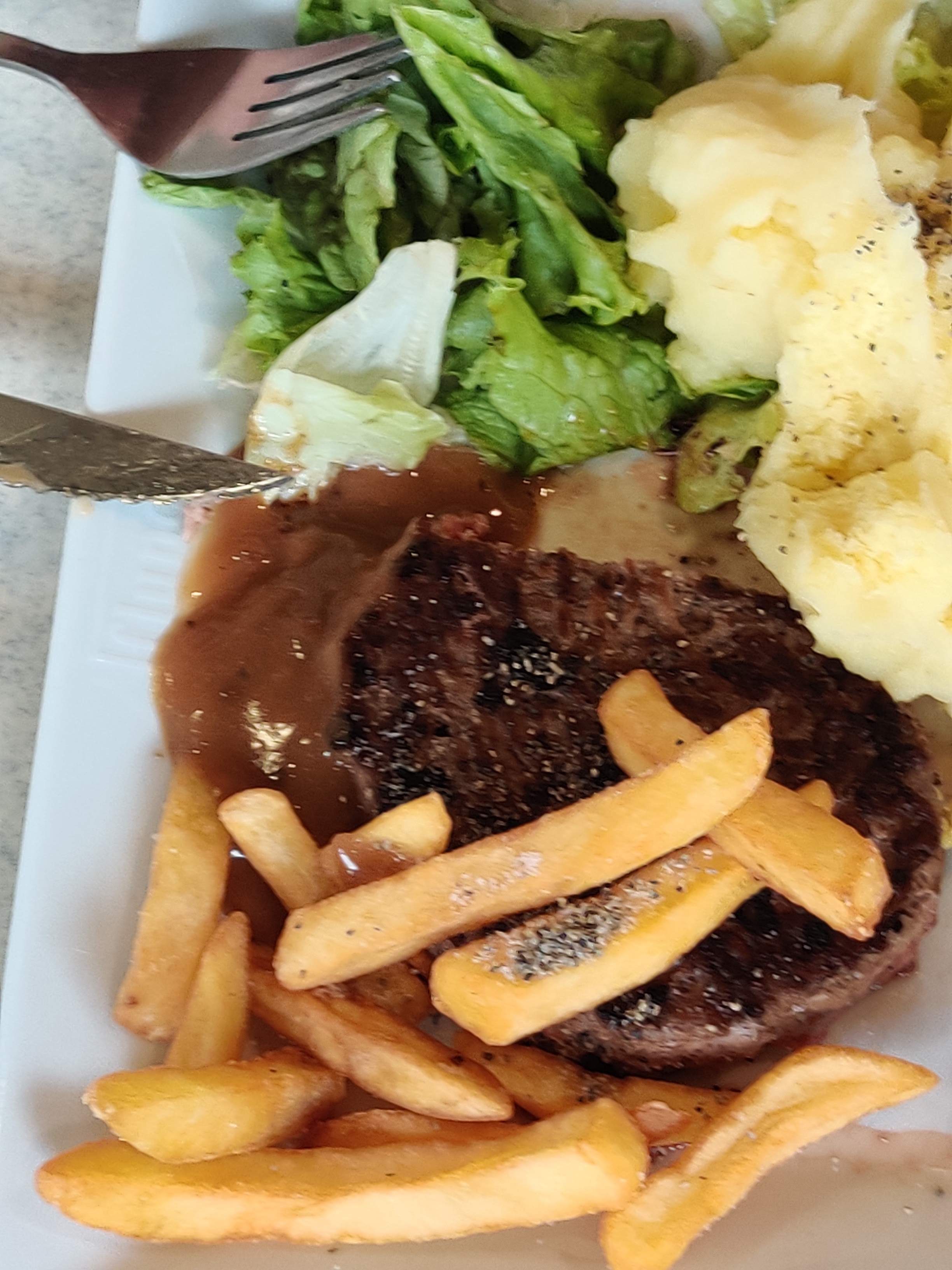 Mercredi 04 mai 2022 un steak ,la pièce du boucher 8 euros et des poussières le Steak d'à peine 100 grammes et quand on Dit au cuisinier que c'est une arnaque celui ci répond qu'il peut le faire plus gros si l'on veut. Le steak tartare a ma petite fille jette dans l'assiette,à peine présentable les condiments, câpres tous droit sortis du congélateur, des glaçons. A ne plus jamais refaire,