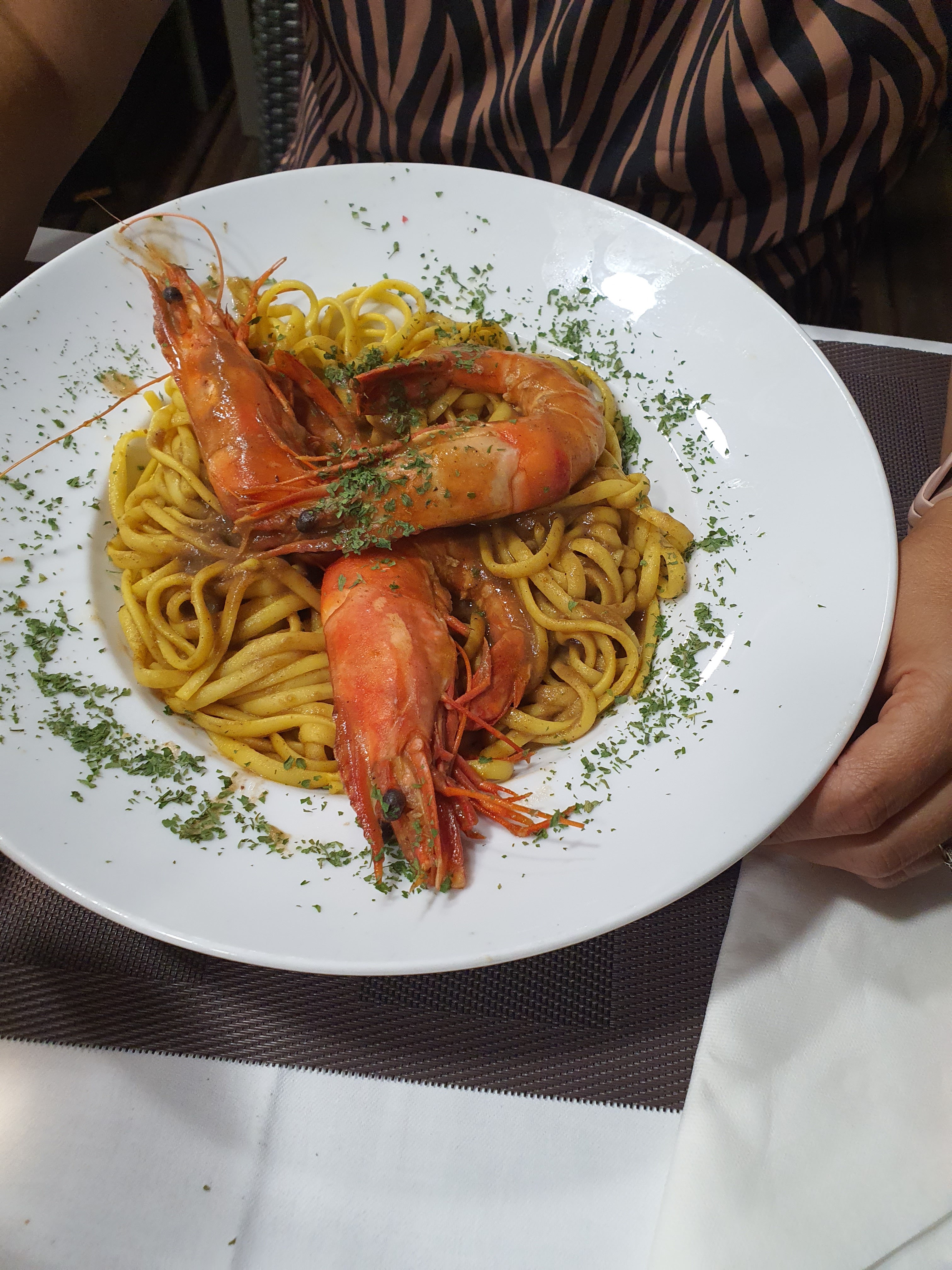 Le service a été essayé durement, mais très incertain. Il n'a pas été possible d'obtenir la recommandation du jour (soupe de poisson) en entrée, j'ai plutôt pris l'autre soupe de poisson (18 euros) du menu d'entrée et elle était grise, même si je n'ai pas laissé la couleur déranger moi au début. Mais malheureusement, la soupe en question était également sablonneuse, ce qui signifie qu'elle n'avait pas été correctement égouttée. Les croquettes de crevettes (15 euros) étaient constituées de 5 petites boules qui 1. n'avaient pas du tout le goût de crevette et 2. étaient encore à moitié liquides (au milieu). La pulpe était bonne, mais malheureusement les légumes étaient brûlés en noir par endroits. Les linguine aux petites moules étaient correctes, mais absolument trop chères à 25 euros. Dans l’ensemble, c’est un bon restaurant, habillé de meubles de jardin en plastique bon marché, de nourriture trop chère et d’un service mal formé. Dommage