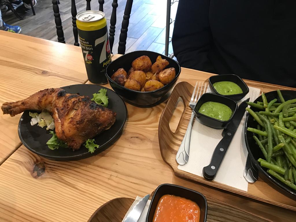 C’était vraiment trop bon! Merci pour ces belles et bonne bananes plantain. Ces frites charnues et croquantes (comme du fait maison), et ce poulet! C’était un peu trop cramé mais avec un petit coup de couteau dessus, le poulet a retrouvé sa belle couleur. Personnel sympa et souriant.